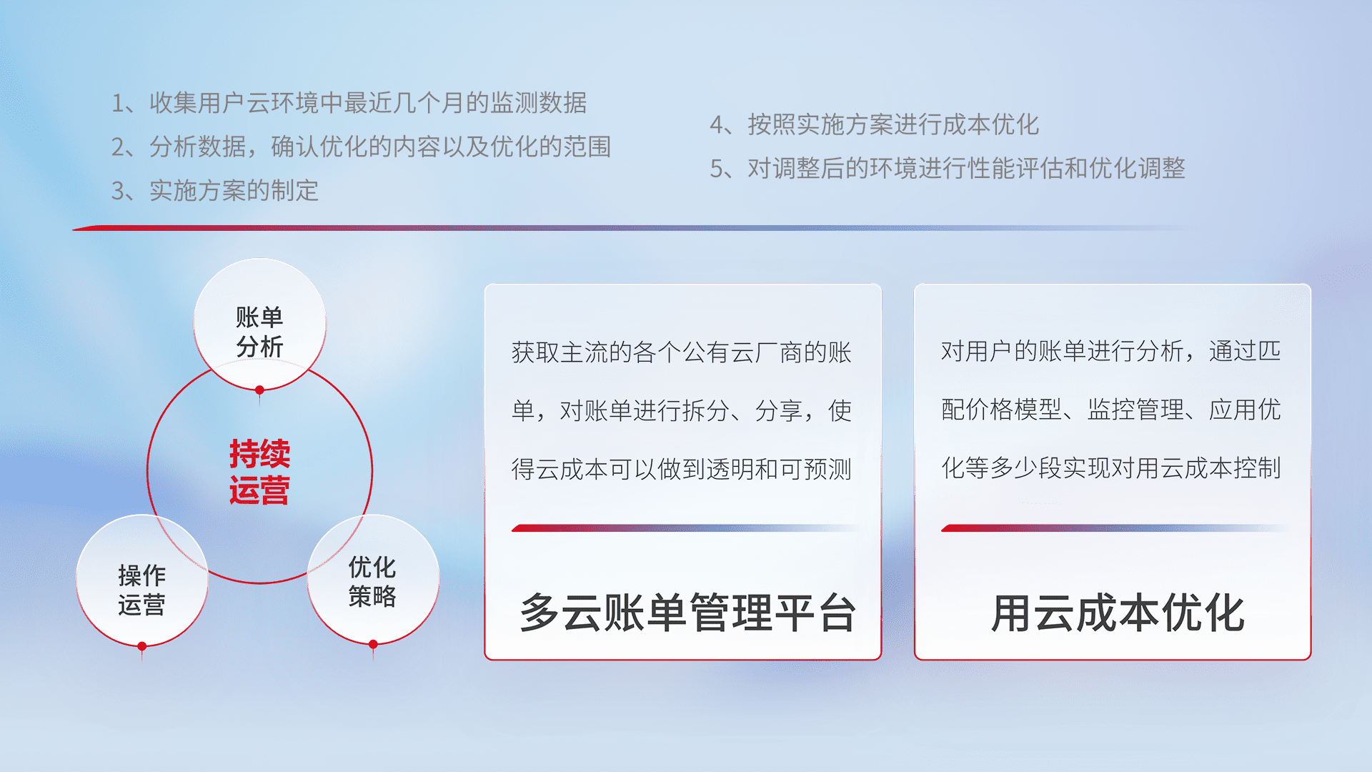 通过多云纳管,,,以统一的资源数据模型把客户的云资源进行抽象和封装,,,,进而实现对多云资源的统一操作,,,,保障云资源管理的可靠性、、稳定性与可用性。。。。量身定制化运维内容,,配置、、开发运维、、、补丁管理、、备份、、、、监控、、、认证和访问管理、、、、审计和日常巡检等,,,保障在用云过程中的可靠度,,稳定度以及高可用率。。。。
